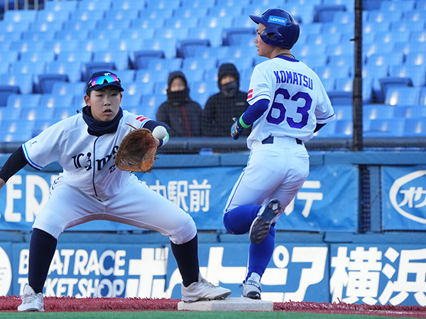 4回表無死、先頭の木村選手が内野安打で出塁、次打者小松選手の送りバントが安打となりチャンスを広げます。1死一、二塁から藤沢選手、尾鼻選手のタイムリーで2点を先制します。