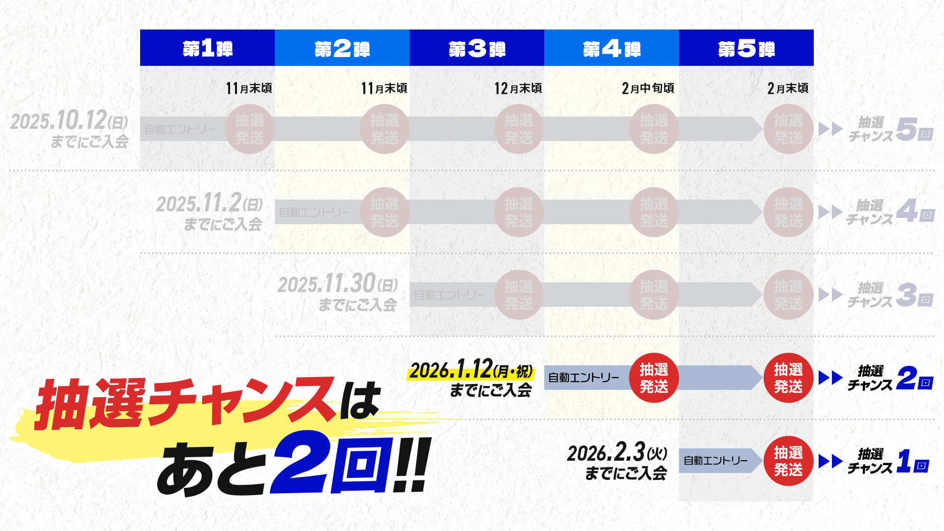 - 抽選への参加は、WEB入会(新規入会または継続入会)の手続きが完了した時点で自動エントリーされます