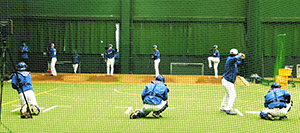 内野陣は堂上コーチ考案のグラブ代わりにメディシンボールを持って、体の正面で捕球の練習。夕方は松中コーチ密着指導の下、鵜飼、石伊選手が右翼ポールを目印にロングティーを敢行。終わるころは真っ暗でした。