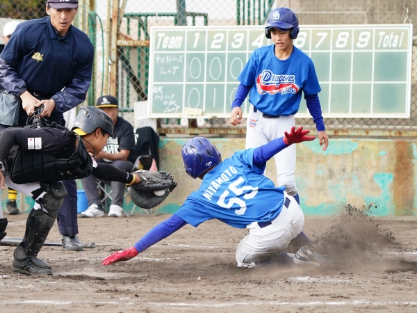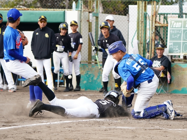 0-1で迎えた5回表1死一、三塁、一塁走者の村下選手が盗塁、キャッチャーが二塁へ送球した間に三塁走者の宮本選手が本塁を狙い生還、1-1の同点に追いつきます。