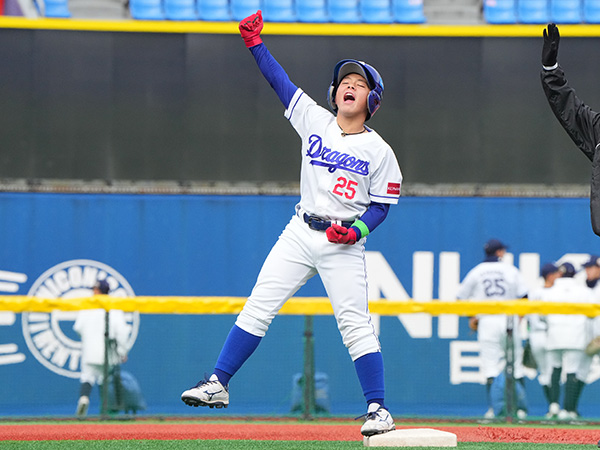 0-2で迎えた4回表無死一、二塁、藤沢選手のタイムリー二塁打で1点を返します。