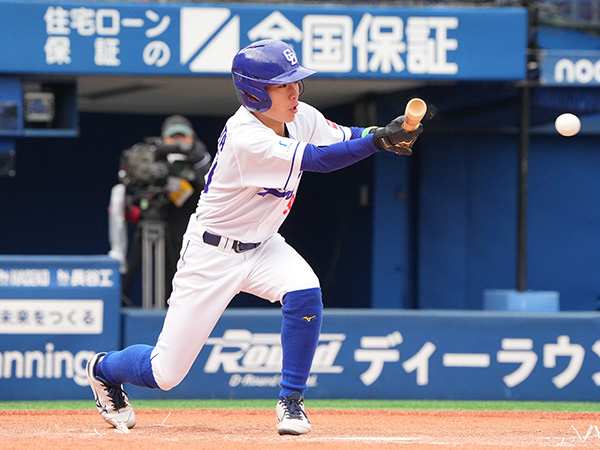 4回表1死二、三塁、セーフティスクイズを決めた村下選手
