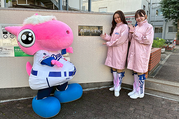 11月4日(火)、港区の西築地小学校でパオロンとチアドラゴンズ2025(MIZUKI、SHIORI)があいさつ活動を行いました。