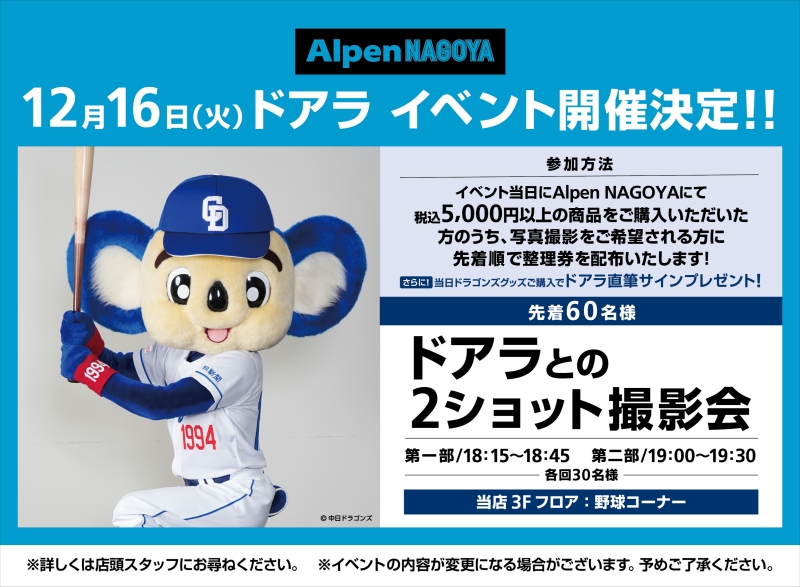 12/16 アルペンナゴヤ「ドアラと2ショット撮影会」のお知らせ
