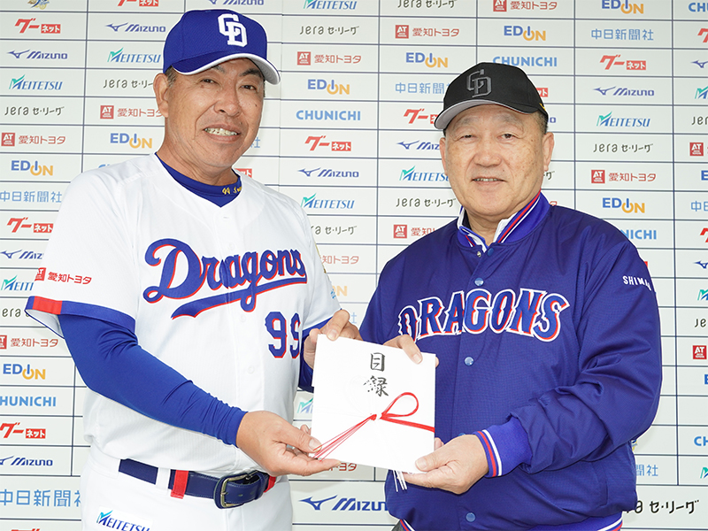 中日ドラゴンズ後援会が激励 2026/2/7 本日(2月7日)、中日ドラゴンズ後援会の嶋尾正会長が北谷球場を訪れ、「強く、誇り高く、勝利を掴め!皆さんのご活躍を心から祈念しております」と井上監督に激励品の目録を手渡しました