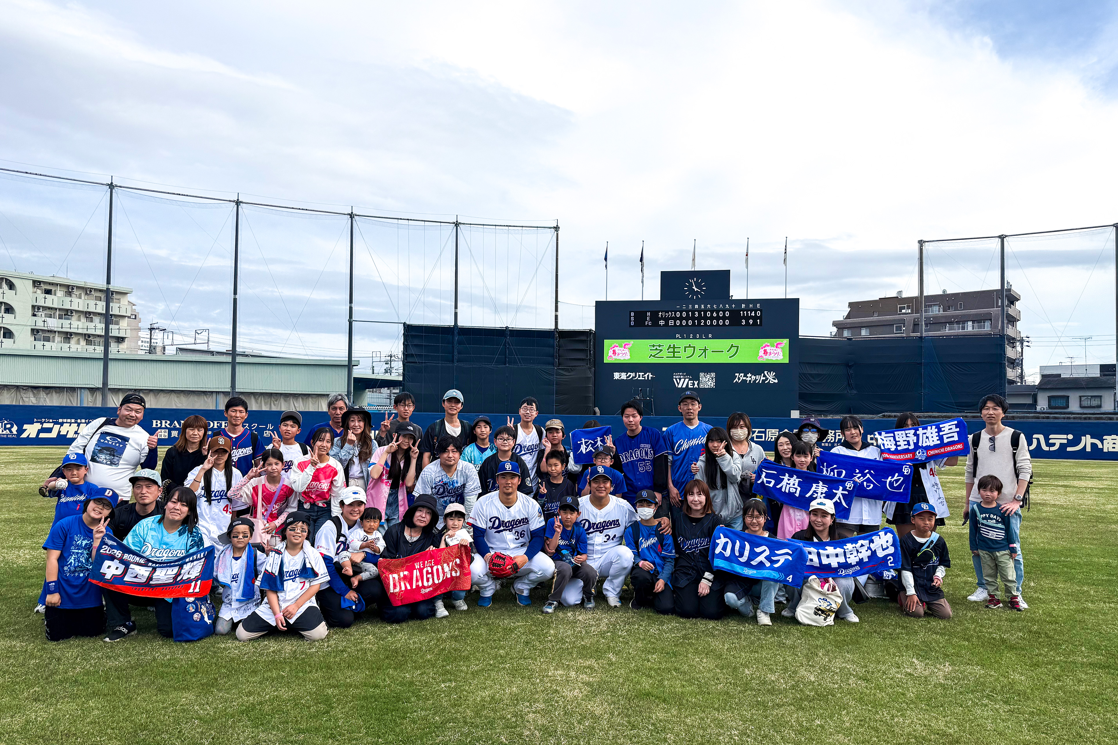 試合終了後には事前募集の芝生ウォークが行われ、熱気の残るグラウンド外野芝生エリアで自由散策を体験いただきました。