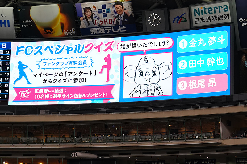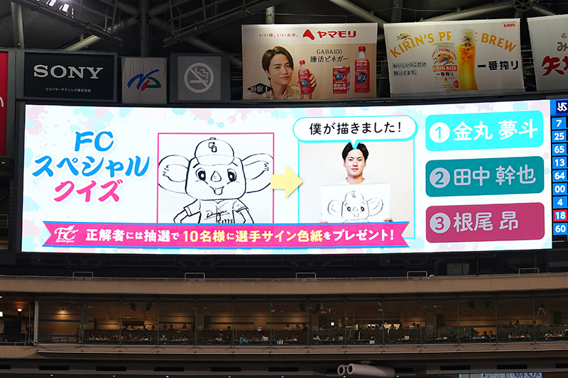2回には106ビジョンを使って、昨年好評だった選手クイズを実施。このドアラを描いた選手は…