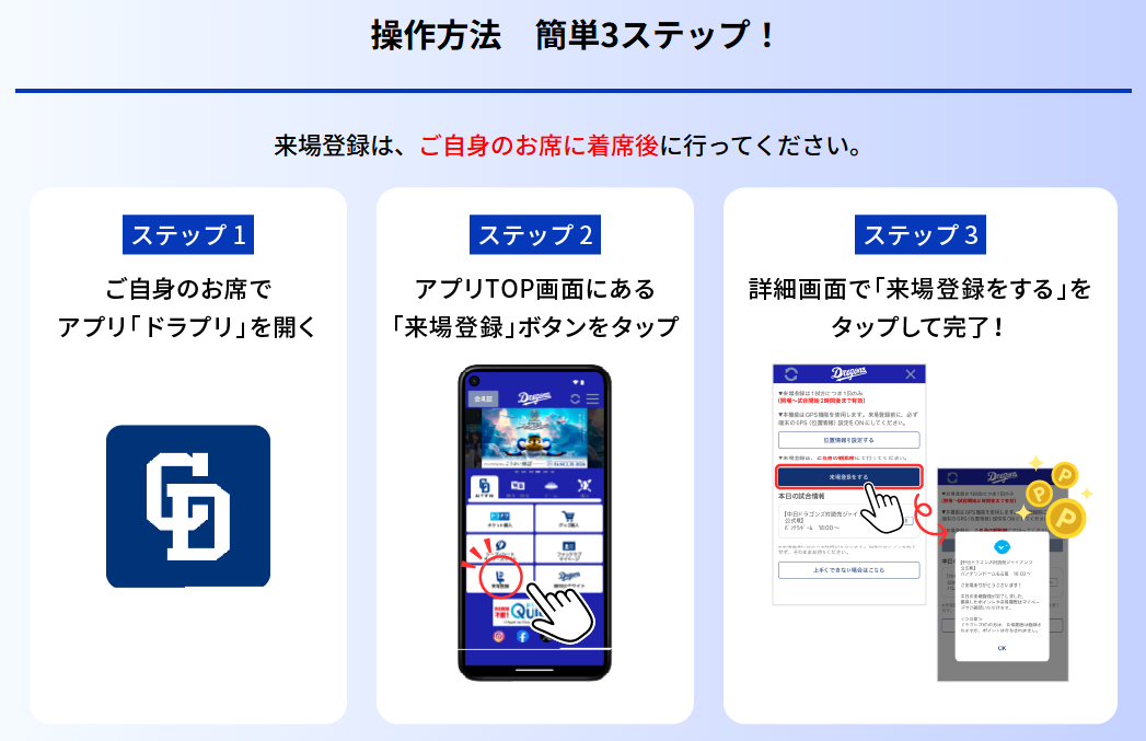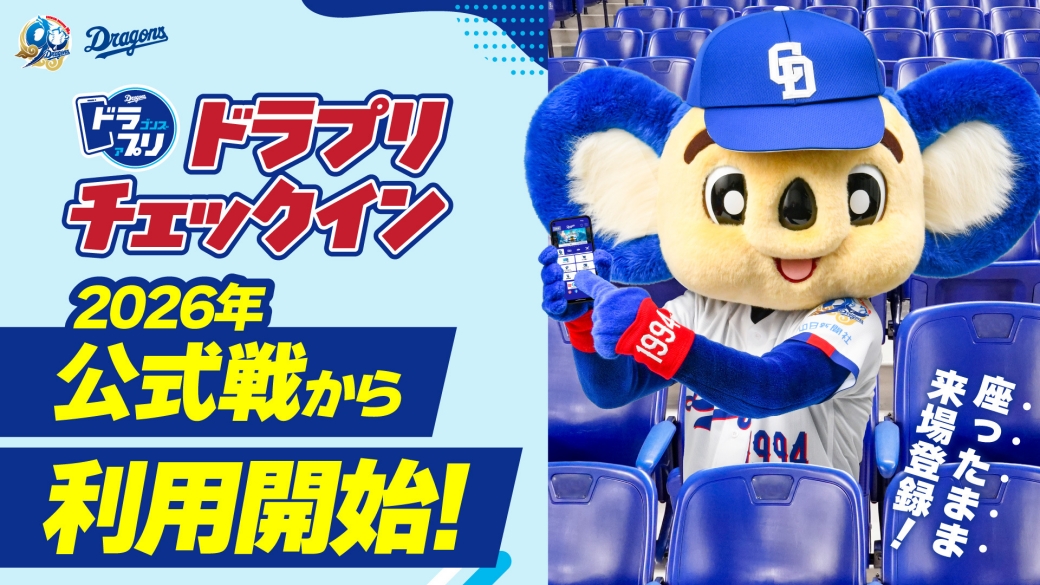 2026年レギュラーシーズン公式戦より、バンテリンドーム ナゴヤ主催試合を対象に、公式アプリから来場登録ができる新機能「ドラプリチェックイン」の利用を開始いたします!