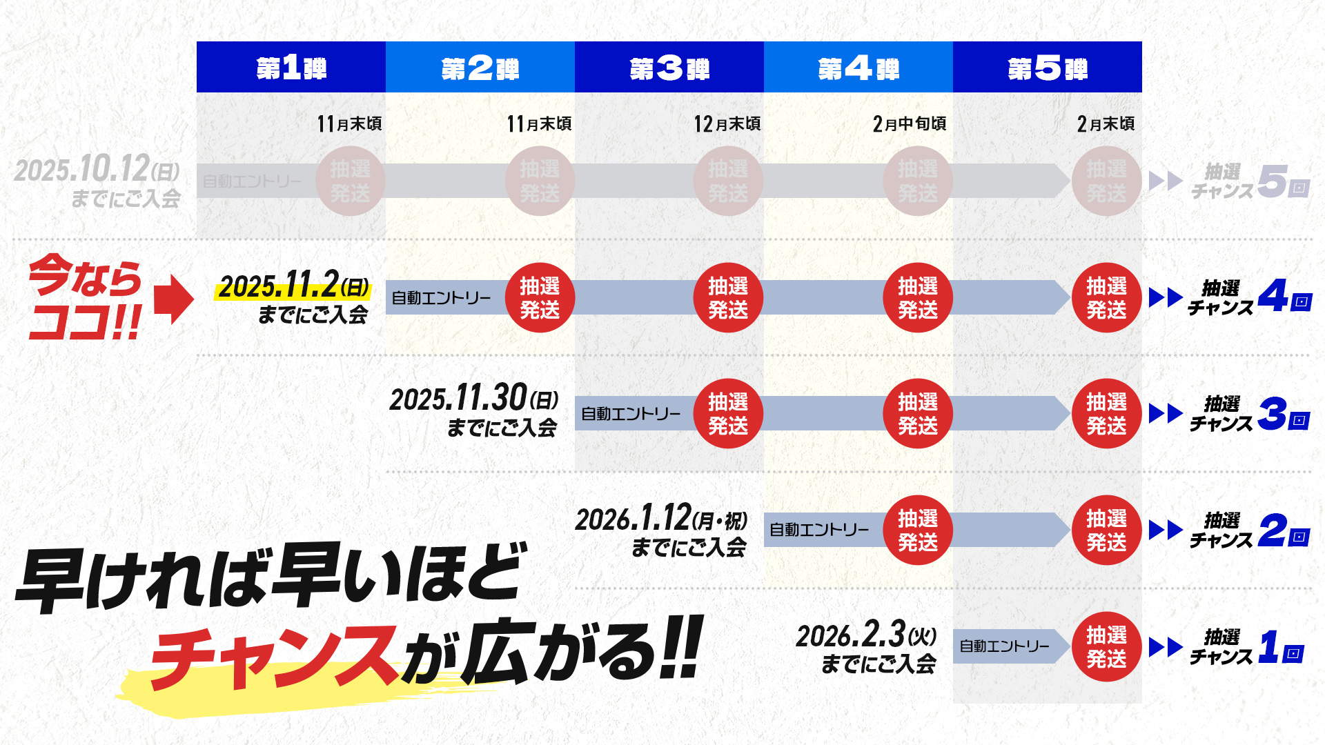 さらに、早ければ早いほどエントリー人数も少ないので、当選確率も当然UP!!