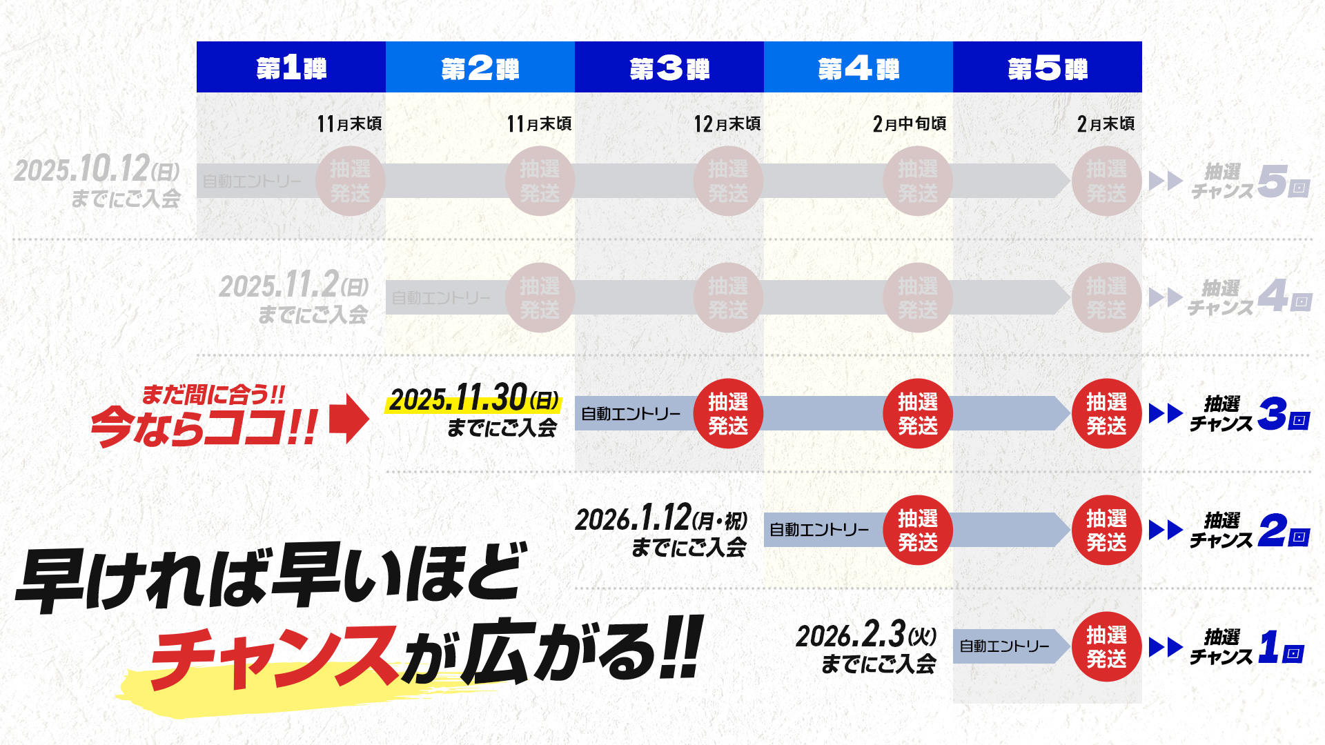 早く手続きすると当選チャンスは最大5回!
