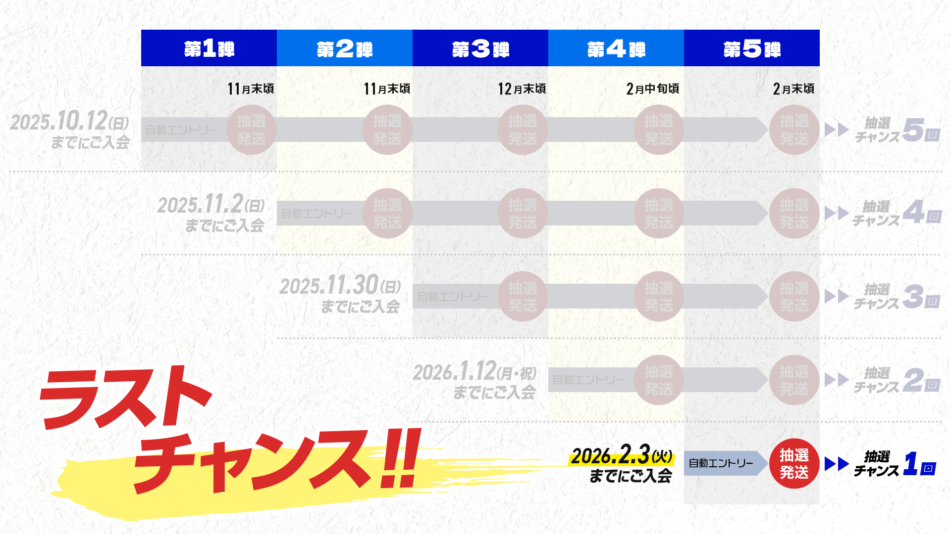 - 抽選への参加は、WEB入会(新規入会または継続入会)の手続きが完了した時点で自動エントリーされます