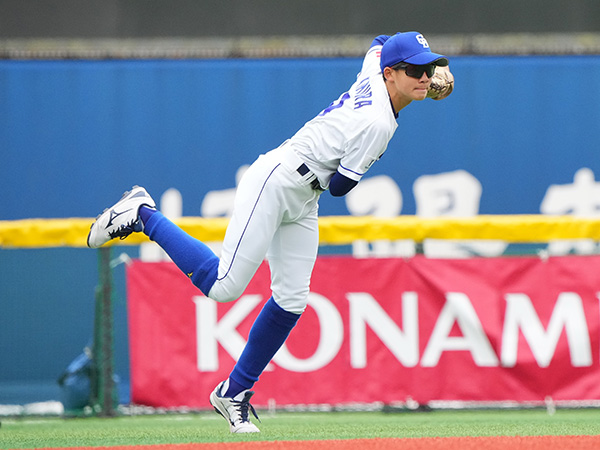 2回裏1死一、三塁、中飛を捕球しバックホームをする木村選手