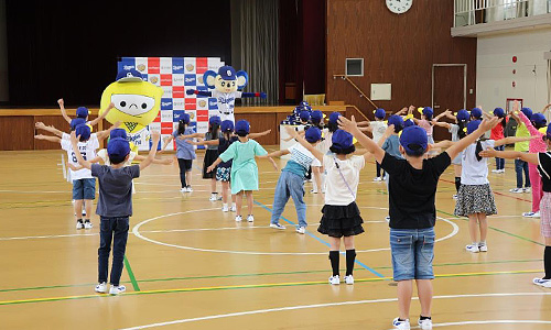 ドアラがオリジナルドラキャップをかぶった新一年生約50人と一緒にラジオ体操をしたり、一年生からの質問に答えたり、児童に色紙のプレゼントをするなどして、楽しく交流しました。