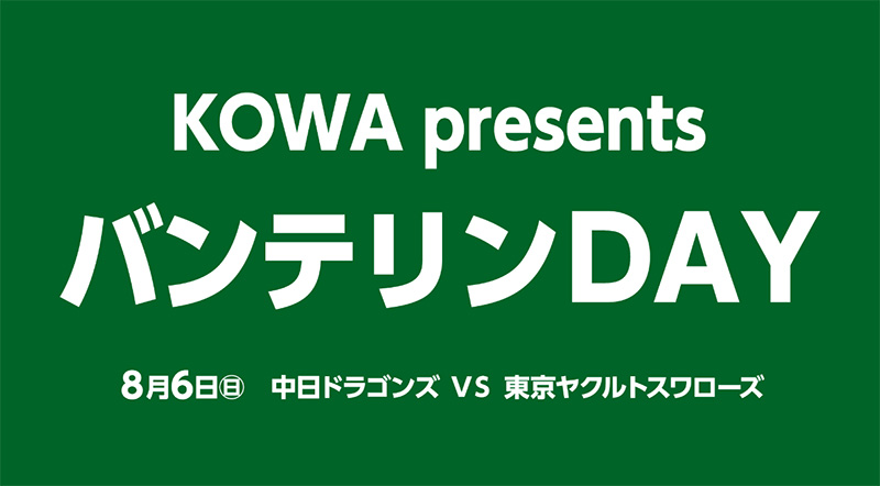 バンテリンドーム ナゴヤのネーミングライツパートナーである興和株式会社が、8月6日(日)の東京ヤクルトスワローズ戦におきまして、「KOWApresentsバンテリンDAY」を開催いたします。