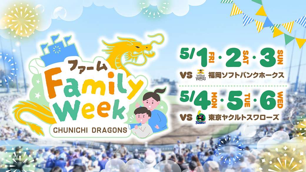 5月1日(金)~3日(日)福岡ソフトバンク戦と5月4日(月)~6日(水)東京ヤクルト戦のゴールデンウィーク6日間、ナゴヤ球場では「ファームFamilyWeek」を開催します。