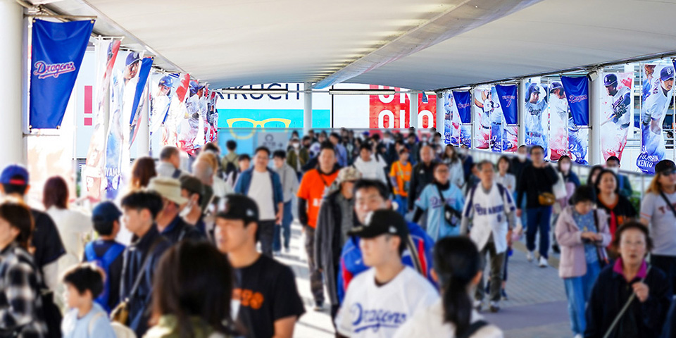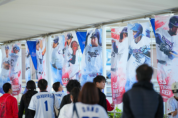 オープニングシリーズ 2026では、ドアラの巨大アクリルスタンド・球団創設90周年巨大オブジェ・ガラス装飾・オリジナルのぼり旗の開幕特別装飾を施しました。