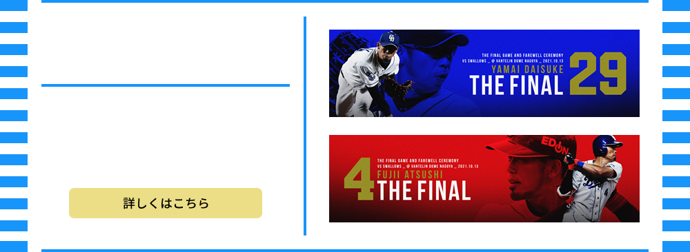 What’s New新着情報 ドラゴンズ アンブレラ テラス再開のお知らせ10月13日・14日 バンテリンドームにご来場されるお客様へのお願い10月13日「山井大介投手・藤井淳志選手」応援ボードデザイン発表「ファイナルシリーズ 2021」 AR企画 “ドアラ&つば九郎 ARナゴヤ場所 千秋楽” を楽しもう「ファイナルシリーズ 2021」 野球ガチャ 販売のお知らせ10月14日 東京ヤクルトスワローズ戦 試合開始時間変更のお知らせ10月14日 バンテリンドーム ナゴヤ最終戦セレモニー開催のお知らせ10月13日 山井大介投手・藤井淳志選手引退セレモニー開催のお知らせ「ファイナルシリーズ 2021」特設ページを公開「ファイナルシリーズ 2021」 10月14日 愛工大名電高校吹奏楽部による演奏を披露「ファイナルシリーズ 2021」 10月12日・13日 つば九郎がバンテリンドームにやってくる!10月12日~14日東京ヤクルト戦 チケット販売要項(料金・発売日)発表 ツイート
