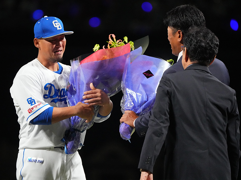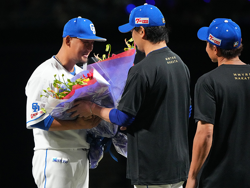 ファイターズ、ジャイアンツ時代のチームメイトからのビデオメッセージがビジョンにながされ、涌井投手、大島選手、家族、サプライズゲストとして登場した栗山英樹氏、稲葉篤紀氏から花束を受け取り、ドームを訪れた多くのファンを前に最後のあいさつをしました。